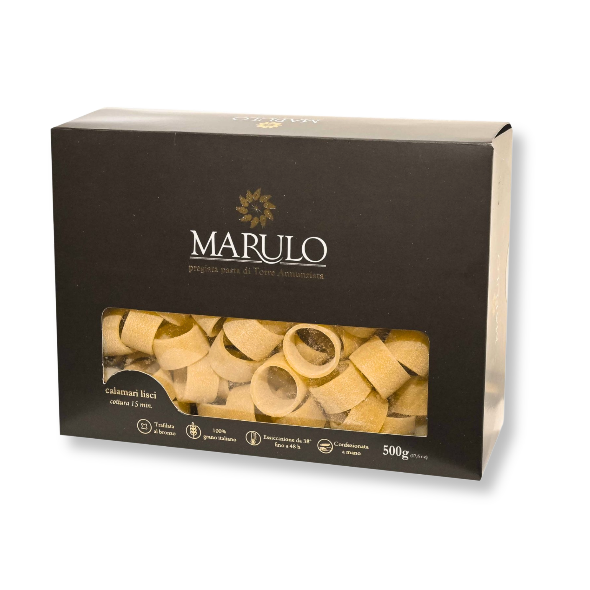 Descrizione: I Calamari Lisci Marulo della linea Sapori Unici sono la massima espressione di eleganza al palato. Nonostante la superficie liscia, la qualità della semola e la lavorazione artigianale permettono una simbiosi totale con i sughi più nobili.