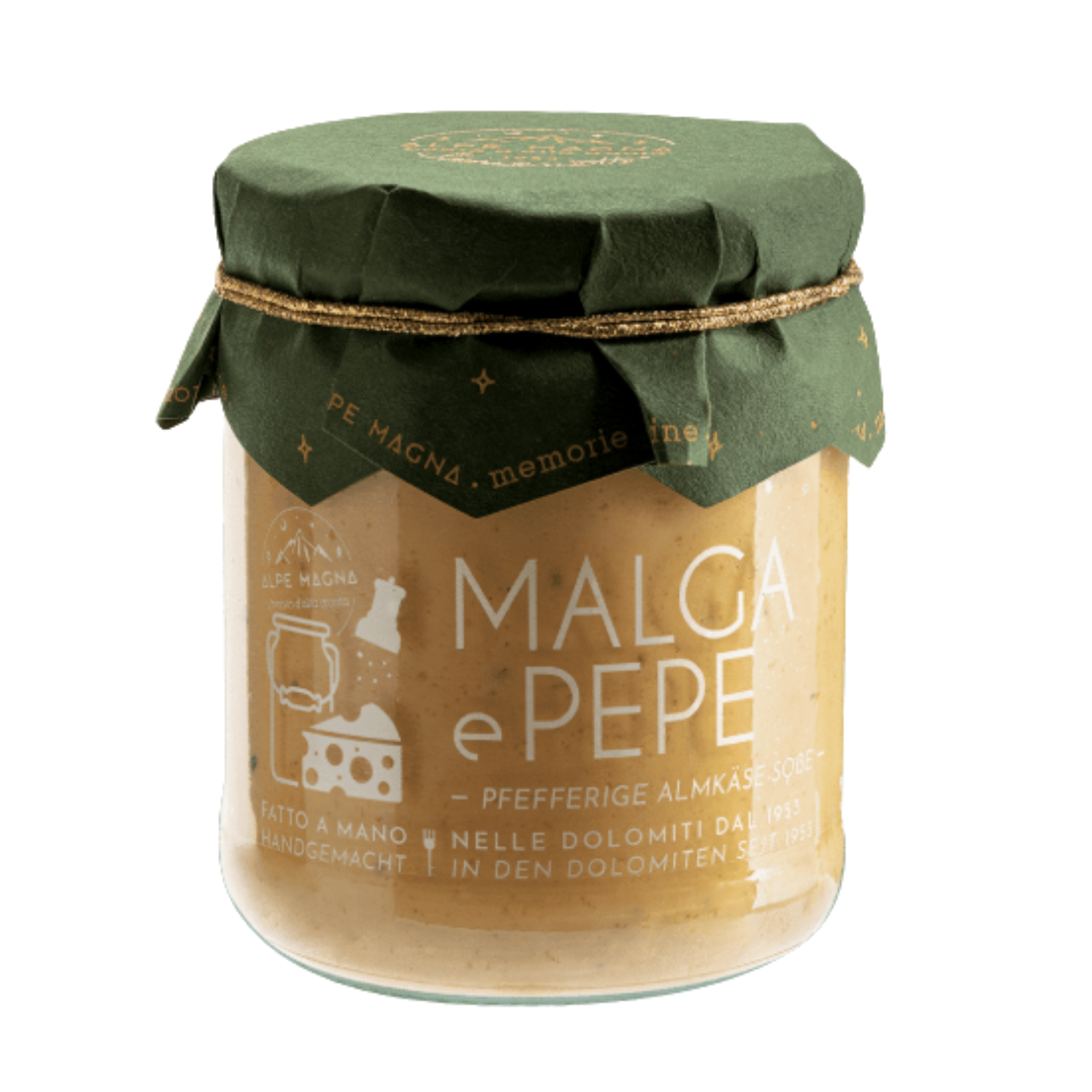Rivisitazione dolomitica della famosa cacio e pepe, creata utilizzando un formaggio a lunga stagionatura fatto esclusivamente con latte di alpeggio delle Dolomiti, dai sentori floreali e pungenti.