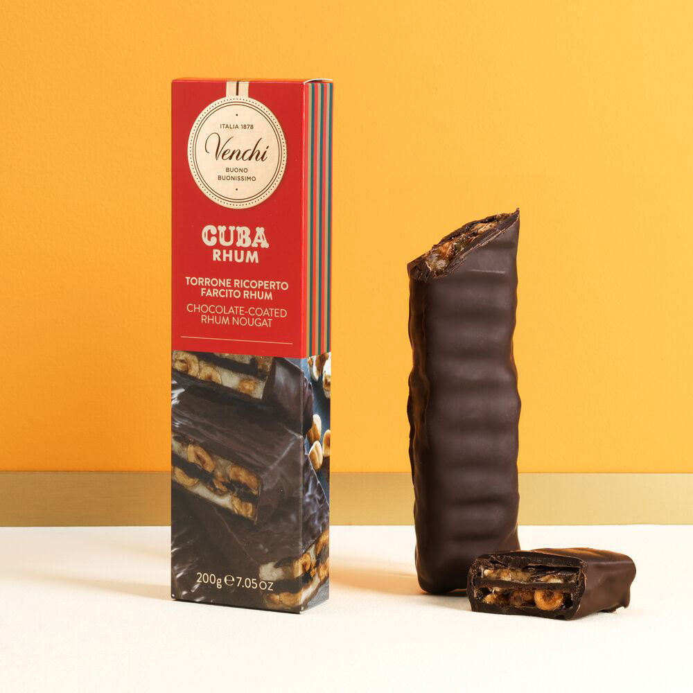 Tradizione e innovazione si incontrano nella stecca Torrone al Rhum Ricoperto: morbido torrone alle Nocciole Piemonte IGP farcito a mano con crema al Rhum e ricoperto di cioccolato fondente,